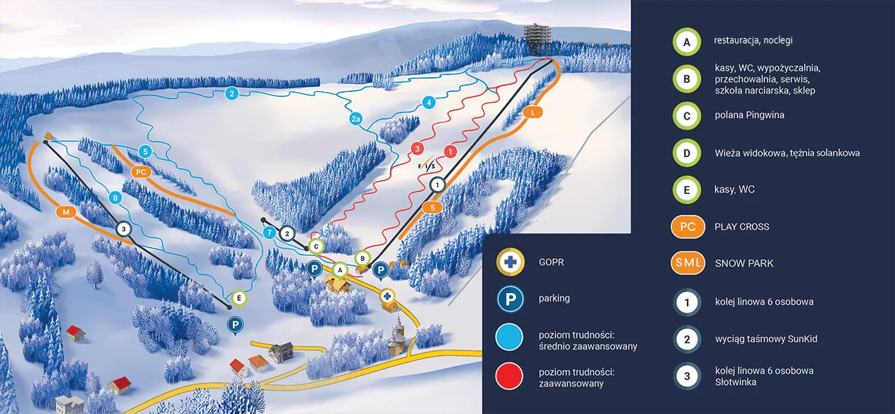 Dzięki umiarkowanemu nachyleniu tras, miejsce to doskonale nadaje się dla osób rozpoczynających swoją przygodę z nartami, jak również dla narciarzy o średnim stopniu zaawansowania. Tuż przy dolnej stacji wyciągu znajduje się „Gospoda u Krakowiaka” – klimatyczne miejsce z kominkiem, oferujące regionalne potrawy oraz możliwość odpoczynku i rozgrzania się po aktywnym dniu na stoku.